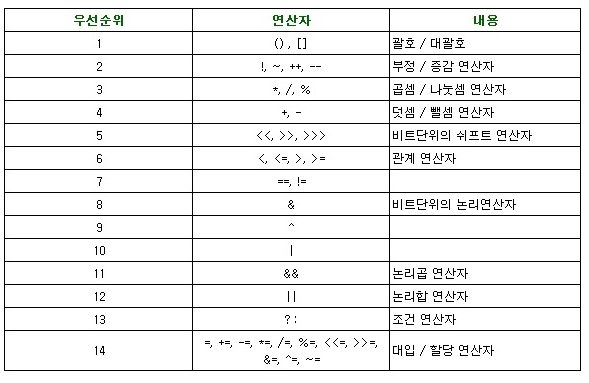 또한 여러 종류의 연산자가 하나의 식에 포함되어 있으면 연산자 우선순위에 따라 연산순서가 바뀌는데 이는 다음과 같다.