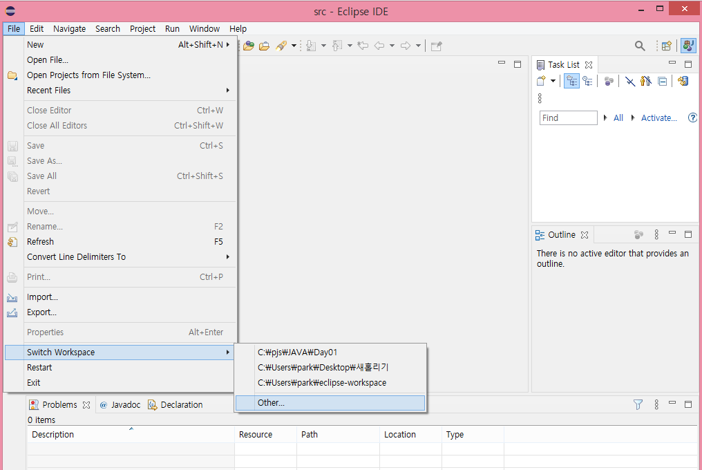 ※ Workspace를 바꾸고 싶은 경우 File>Switch Workspace>Other에서 원하는 경로를 재지정 해주면 됩니다.