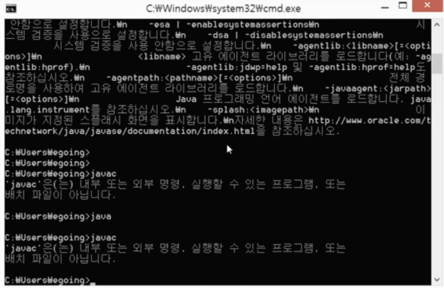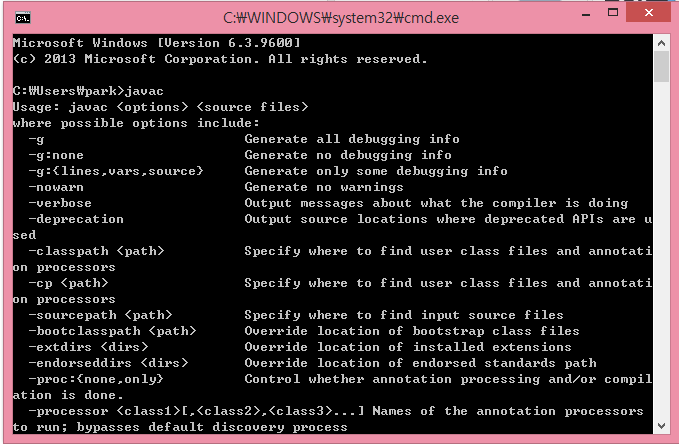 10. 다시 cmd창으로 돌아와서 cmd를 껐다 킨 후 javac를 입력했을 때 다음과 같이 출력되면 성공적으로 설치한 것입니다.