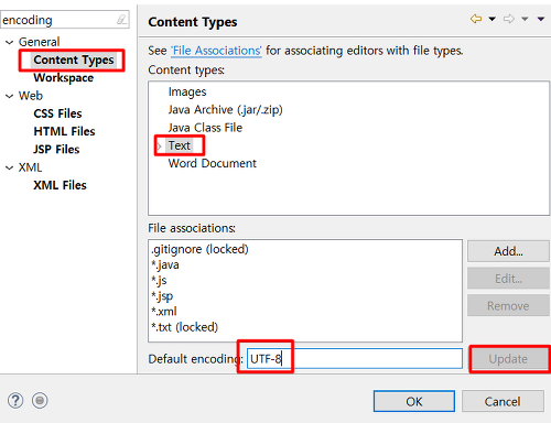 그러면 하단에 Default dencoding: 란이 있는데 여기에 UTF-8입력 후 오른쪽 Update 눌러줍니다.