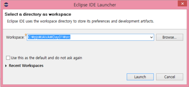 6. 이클립스를 처음 시작하면 Workspace를 설정하는 창이 먼저 보이게 됩니다.