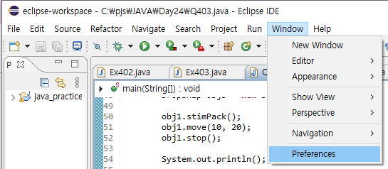 1. window -> preferences 로 들어갑니다.