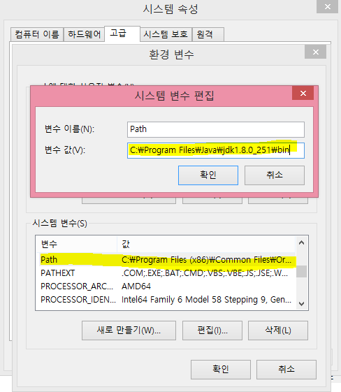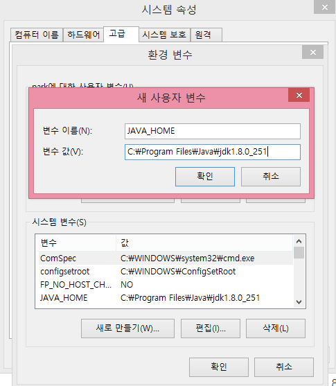 변수값에 복사한 주소에서 \bin을 빼준 C:\Program Files\Java\jdk1.8.0_251 만 입력해 주고 확인을 눌러줍니다.
