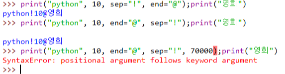 ※ sep과 endsep, end 둘의 순서는 상관이 없다. 단, 문자열과 숫자가 같이 있을 떼, 가장 뒤에 써야 한다.