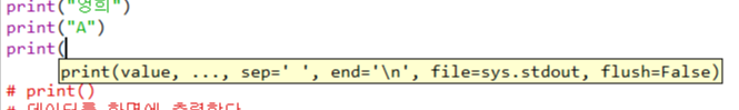 "print(" 까지만 입력하면 아래와 같이 쓸수 있는 기능들이 미리보기로 제공되는데 기능은 다음과 같다.