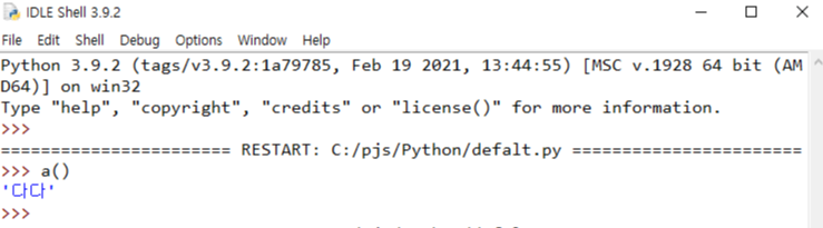 main()상에 함수는 존재하기 때문에 프롬프트에서 a()를 입력해주면 다음과 같이 '다다'가 출력된다.