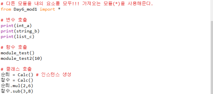 따라서 Day6_mod1모듈 내의 모든 요소를 import하겠다는 뜻으로 다음과 같이 작성해준다.