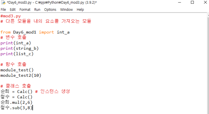 (*)를 통해 Day6_mod1 모듈 내의 모든 요소를 import 해주었기 때문에 위와 같이 오류없이 내용을 실행한 모습을 볼 수 있다.
