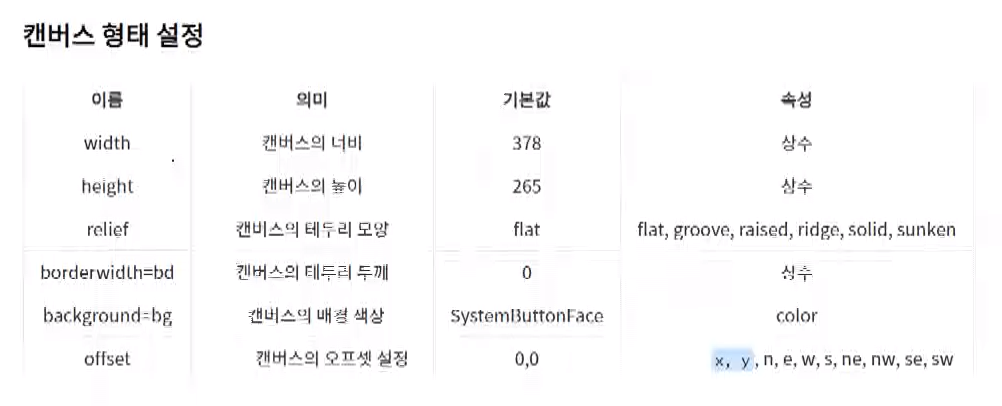 Canvas 위젯도 클래스형태이다. 또한 윈도우 창에서 스케치북 같은 역할로 안에 선, 다각형, 원 등을 생성할 수 있다.