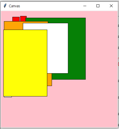 일단 다음과 같이 캔버스를 만들고 안에 사각형을 만든다. 사각형의 색상을 random 모듈의 choice() 함수를 이용해 임의의 색상을 하나 뽑아 설정해준다. 그리고 크기도 randint() 와 randrange() 를 사용하여 랜덤하게 설정해준다.